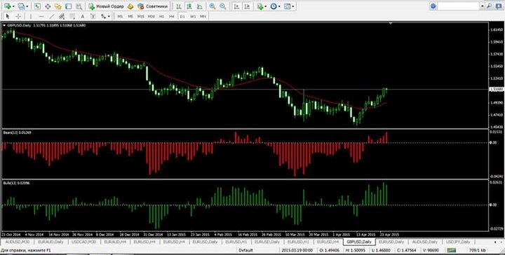 Можно наблюдать что в D1 как активно быки. 1,53 это зона теста цены. В дневной интервале Фибо уже коснулся 23,6. Все это хорошо, но пока что цена в вержной части MA(21) и еще индикаторы bears,bulls в положительном зоне. Из за этого пока нету точного сигнала для продажы